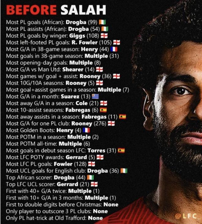 最近@LFC_发布了《萨拉赫之前/之后》英超纪录对比榜单,我一眼扫过去就乐了:上半张是德罗巴、亨利、鲁尼这些老熟人撑着场面,下半张直接被萨拉赫刷成一条龙。你说这画面像不像——别人是“占一两条”,他是“能写的几乎都写了”。数据截至撰文时间(北京时间2025年12月15日)。这张图放这儿不需要多解释,光看名字和数字就知道为什么